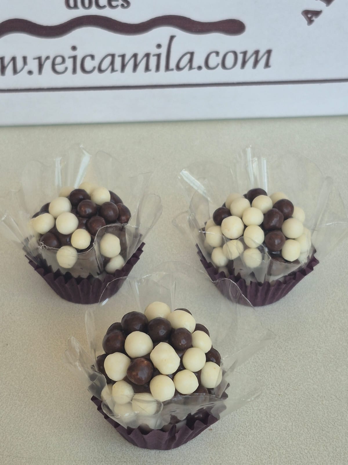 Brigadeiro de chocolate 50% cacau, passado no confete tipo M&M's.